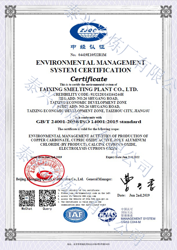 泰興冶煉廠有限公司(原泰興冶煉廠),始建于20世紀(jì)70年代初,現(xiàn)位于江蘇省泰興經(jīng)濟(jì)開發(fā)區(qū)。歷經(jīng)40年的創(chuàng)新驅(qū)動(dòng)、穩(wěn)健發(fā)展,已成長為一家專業(yè)生產(chǎn)堿式碳酸銅、高純電鍍氧化銅、氧化亞銅、氧化銅、無水硫酸銅、海綿銅粉及副產(chǎn)品聚氯化鋁(凈水劑)等系列無機(jī)鹽產(chǎn)品及處置不含氨的氯化銅蝕刻液(HW22)15000噸/年的“國家高新技術(shù)企業(yè)”和地方性骨干企業(yè)。公司總占地面積3.7萬平方米,建筑面積4萬平方米,注冊(cè)資本2088萬元,固定資產(chǎn)1.2億元,年產(chǎn)值約7億元。